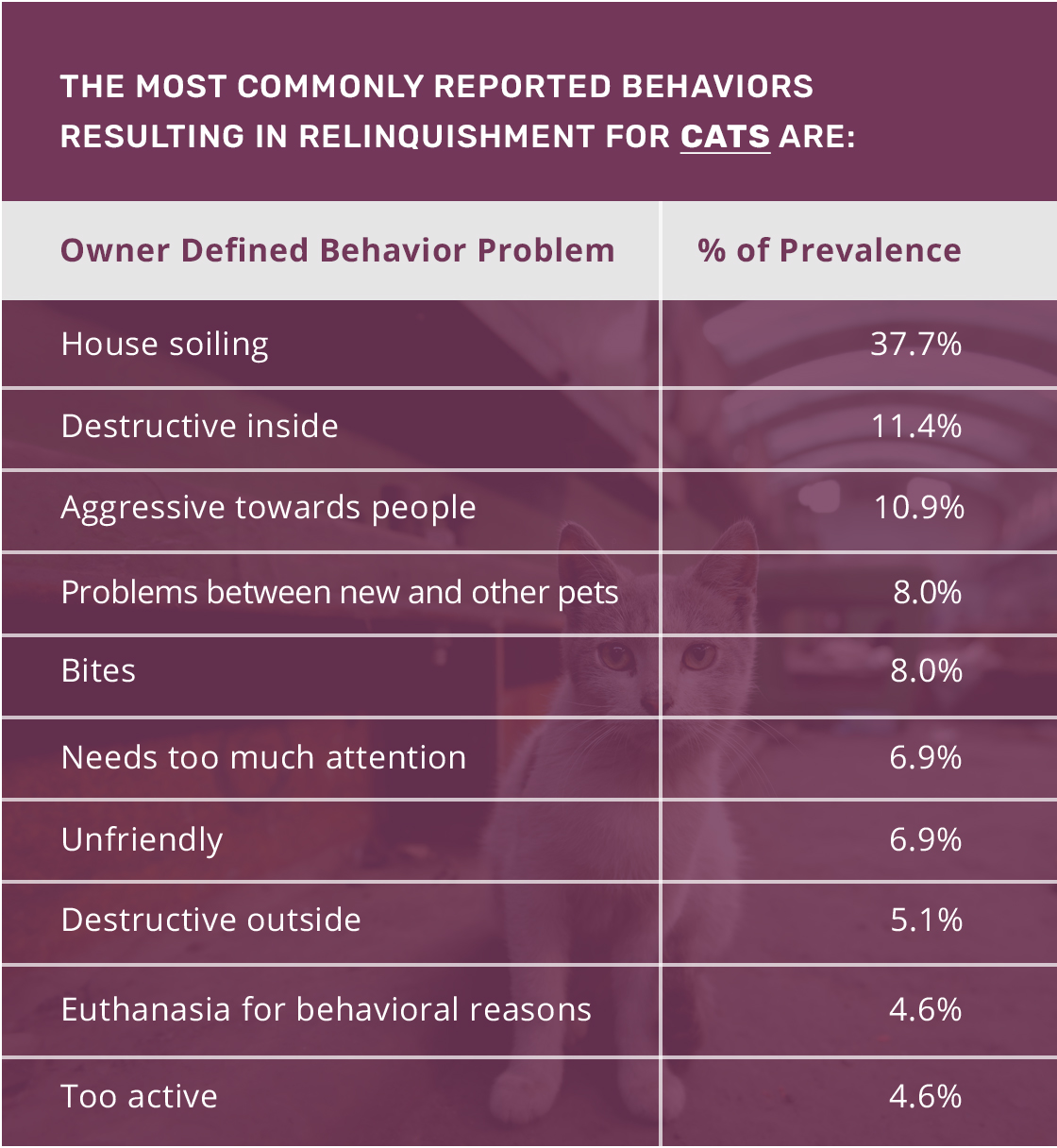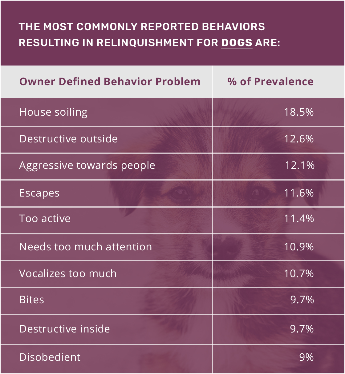 The result of undesirable and misunderstood behaviors may damage the bond between the pet and the pet owner. Unfortunately, all too often, this leads to relinquishment, abandonment or euthanasia. In one study, animal shelters reported that 40% of the dogs in their shelter had been relinquished due to behavior problems (Patronek & Glickman, 1996).